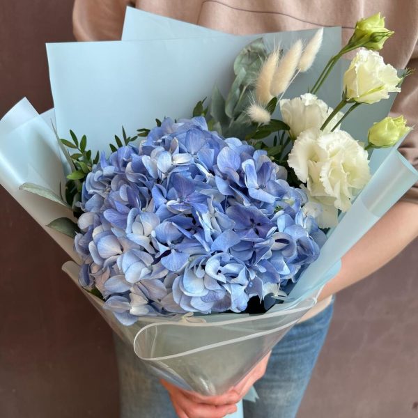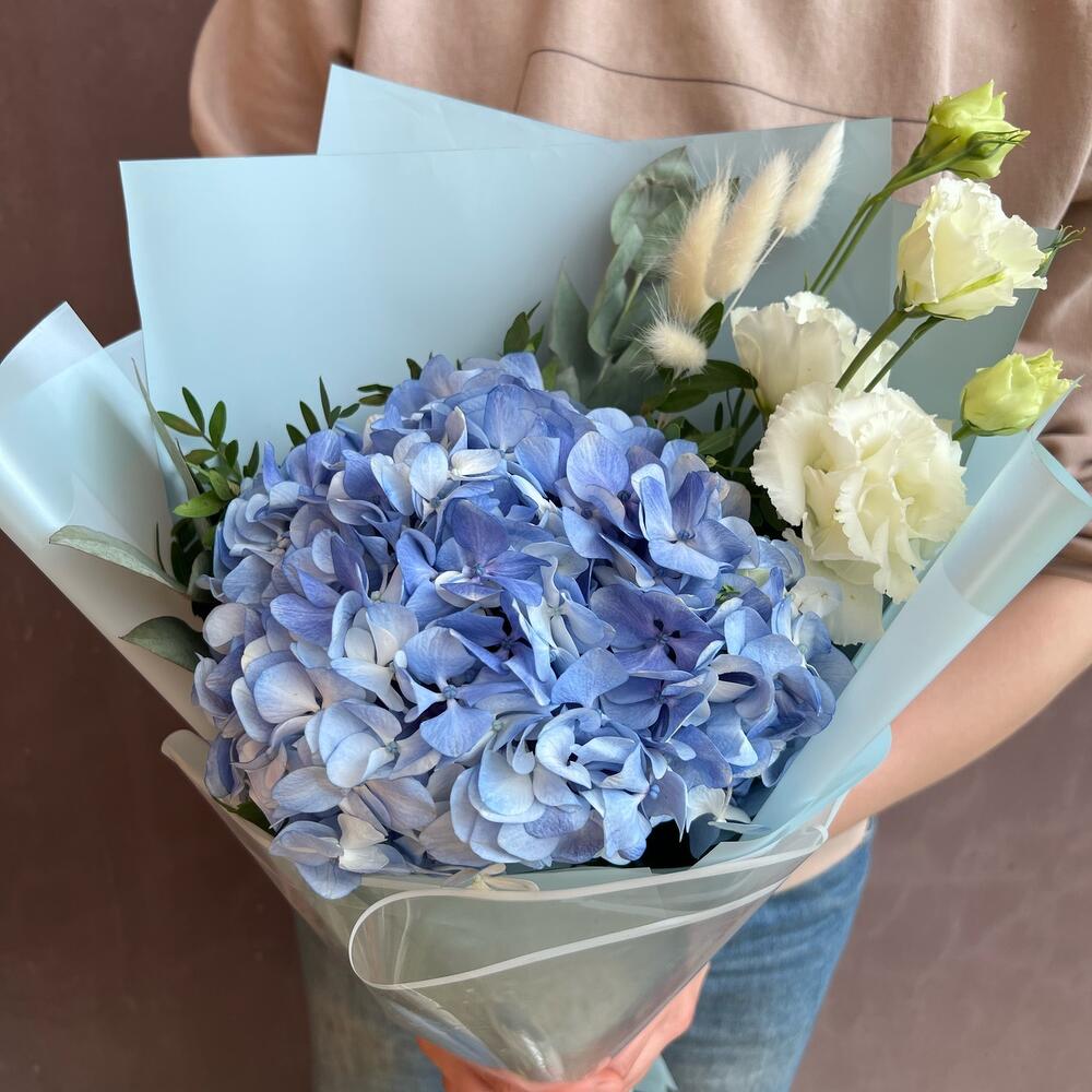 Облако гортензии в упаковке цвета летнего неба – легкий, объемный, воздушный букет!