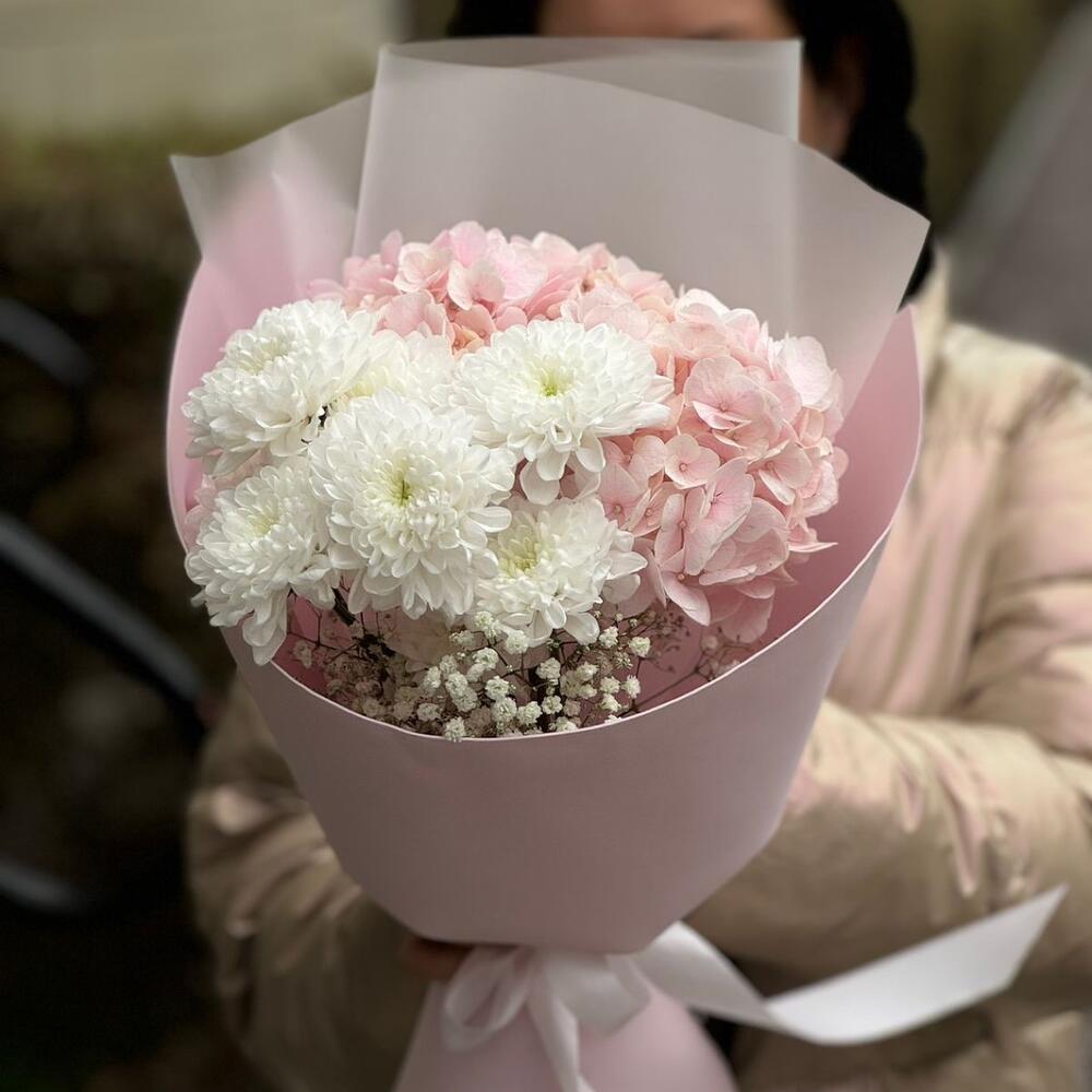 Букет девушке из гортензии, гипсофилы и хризантемы.