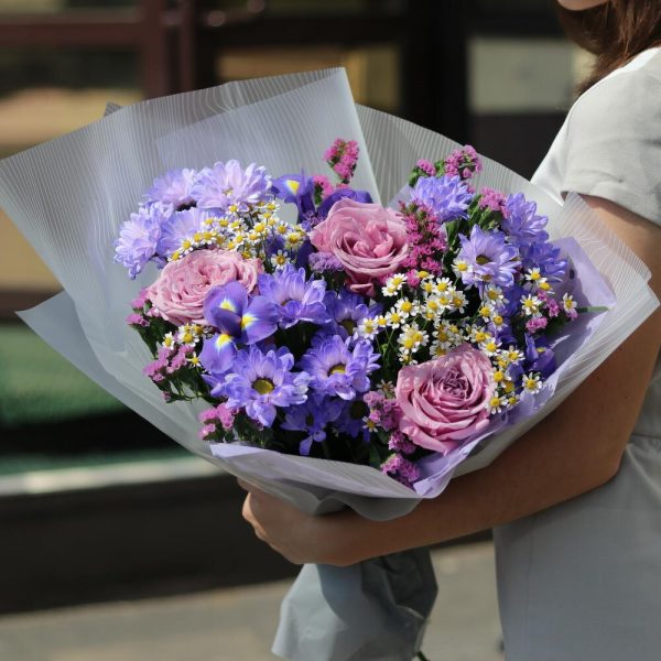 Этот дизайнерский букет из сиреневых розочек, очаровательного танацетума, ромашек и статицы, оформленный в стильной упаковке, станет настоящим источником вдохновения и радости. Нежные оттенки и разнообразие текстур создают гармоничное сочетаниедля девушки, жены, любимой, подруги. Подарите этот букет, и он станет символом ваших искренних чувств, наполняя каждый день светом и счастьем